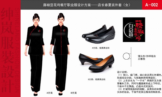 采用立领、七分袖设计,直门襟和偏门襟用来区别店员和店长的级别划分,整体色调采用黑色与VI色系及店面装修风格统一,门襟处运用红色镶边工艺处理,整体给人高档、简洁、时尚的中式快餐的风格。