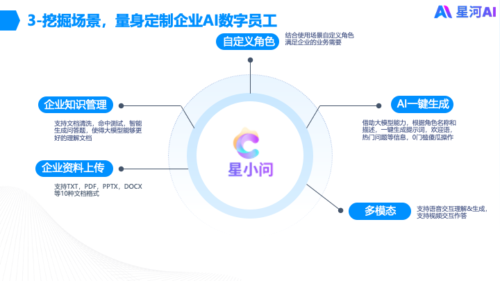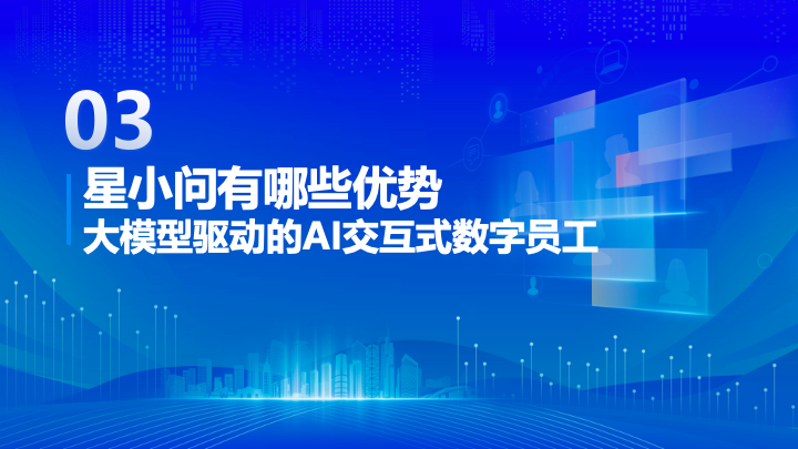 星小问是星河AI推出的面向企业场景的数字员工解决方案,依托可私有部署的LLM大模型,并结合企业业务场景和私有数据二次训练,为企业提供全流程AI交互式数字员工的制作、生产和发布服务.